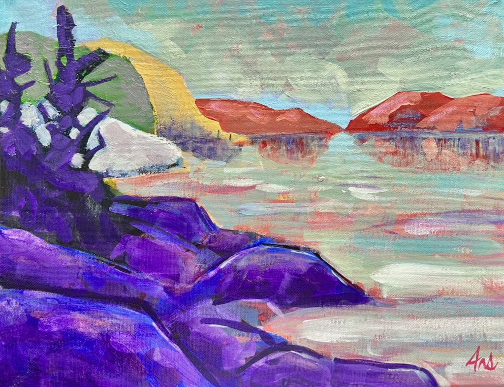 The intricacies and moments of everyday life inspire my work-a walk through the community forest, trees by the side of the road, filtered light through sparkling waters… I approach a painting with a vision of the colours and composition I want to accomplish, but the painting process is more of an experiment than a planned conversation. Each new layer of paint reacts to the one before it, creating a dialogue between myself and the artwork. I’ve discovered that the best work comes from conversations between the artist and the piece.